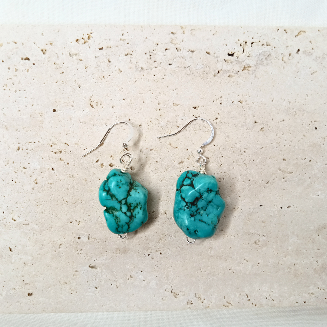 Add a splash of turquoise radiance to your look with our Rock Earrings. The large, turquoise-dyed howlite stone is beautifully showcased by the clean lines of stainless steel components, making these earrings a stunning addition to any jewelry collection. Designed for the fashion-forward diva, these earrings offer a perfect mix of bold color and sleek style, ensuring you rock every look with confidence.